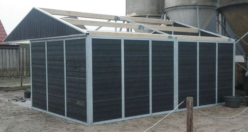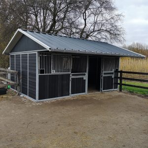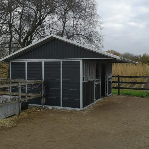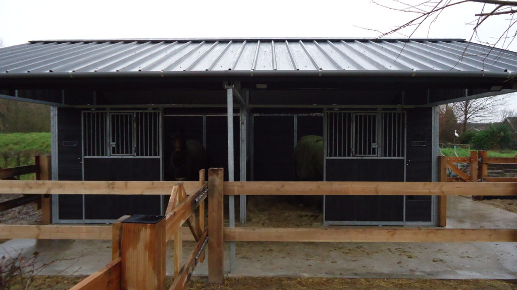 Buitenstal voor paarden met hekwerk, buitenstal in aanbouw, buitenstal met driedelige deuren en buitenstal met een veulendeur.